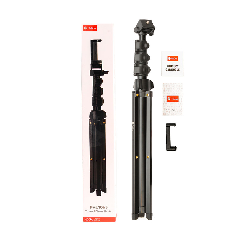 سه پایه موبایل و دوربین مدل PHL 1065یکی از محصولات شرکت «Proone» است. این محصول دارای کالایی با کیفیت بالا است که میتوان برای تولید محتوا ویدئویی، عکاسی و تصویربرداری از آن استفاده کرد. سه پایه پرووان دارای پایههای قابل انعطاف همراه با زیره پلاستیکی شیاردار برای جلوگیری از لیز خوردن روی سطوح مسطح قرار گرفته است. این ابزار جانبی دارای یک هولدر نگهدارنده قابل تنظیم برای موبایل و دوربینهایی با وزن کمتر از 2 کیلوگرم است. جنس قسمت بالایی این محصول از پلاستیک ABS و پایههای آن از جنس آلومینیوم میباشد. یکی از قابلیتهای این سه پایه چرخش به صورت 360 درجه است که کار با این محصول را لذت بخشتر کرده است. طول این محصول در حالت جمع شده 51 سانتیمتر، حداقل ارتفاع 60 سانتیمتر و حداکثر ارتفاع 169 سانتی متر میباشد.