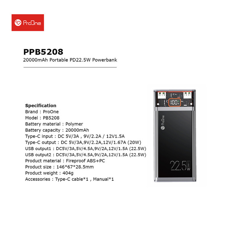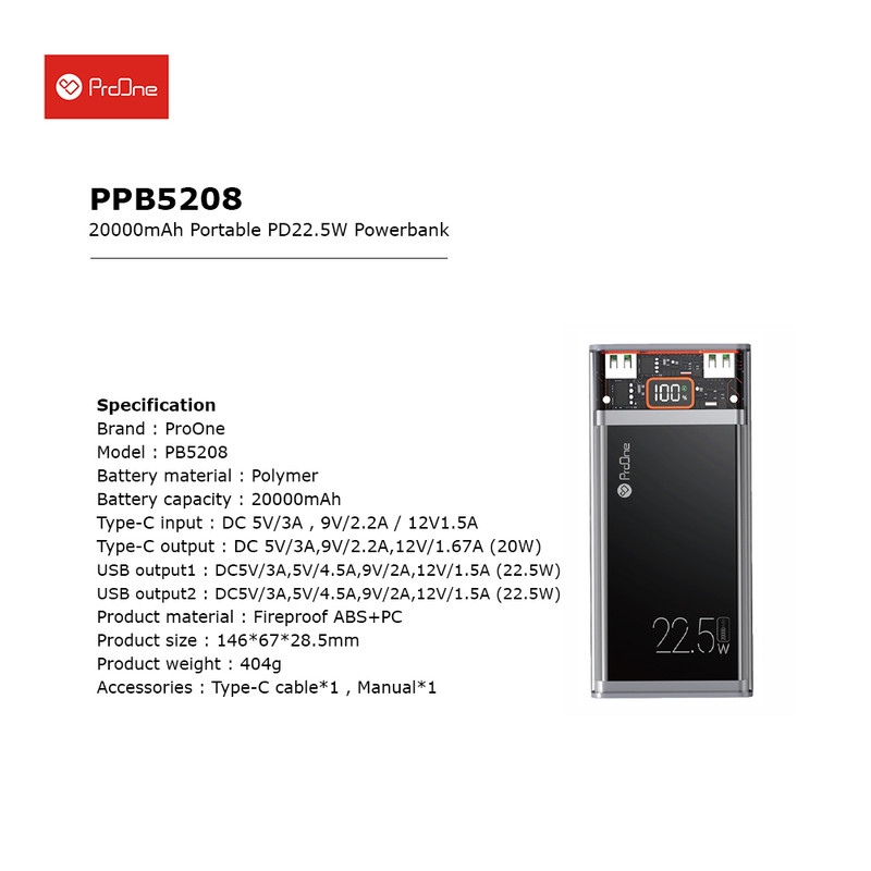 پاوربانک پرووان PPB5208 از جمله محصولاتی است که میتواند با ظرفیت 20000 میلی آمپر و کیفیت بالایی که در ساخت آن به کار رفته نیاز قشر گستردهای از جامعه را برطرف کند. پاوربانک پرووان PPB5208 از یک باتری لیتیم پلیمری با ظرفیت 20000 میلی آمپر بهره میبرد. شما با این پاوربانک پرووان دیگر دغدغه تمام شدن زودهنگام باتری موبایل را نخواهید داشت. باتری پاوربانک پرووان PPB5208 از کیفیت و ماندگاری بالایی برخوردار است که شما به دفعات زیاد میتوانید از آن استفاده کنید. ظرفیت این پاوربانک به اندازهای است که میتوانید به نسبت ظرفیت باتری دستگاهتان، آن را به دفعات شارژ کنید. پاوربانک PPB5208 از دو درگاه خروجی 5 ولت با شدت جریان 2 آمپر بهره میبرد که توان خروجی معادل با 22.5 وات را به شما ارائه میدهد. این توان کافی است که بتواند دستگاه شما را در زمان مناسب به صورت فست شارژ کند. البته لازم به ذکر است که شما میتوانید از هر دو خروجی برای شارژ هم زمان دو دستگاه استفاده کنید، که در این صورت توان خروجی اندکی کاسته میشود. پاوربانک پرووان PPB5208 میتواند در مدت زمان 5 ساعت شارژ کامل شود و مورد استفاده قرار گیرد. پاوربانک PPB5208 از فناوری شارژ سریع کوالکام (QC) و انتقال سریع شارژ (power delivery) بهره میبرد.از دیگر ویژگیهای پاوربانک پرووان PPB5208 که آن را از دیگر محصولات متمایز کرده است وجود یک نمایشگر دیجیتال است.