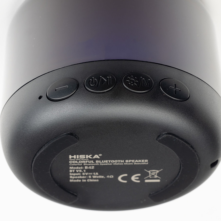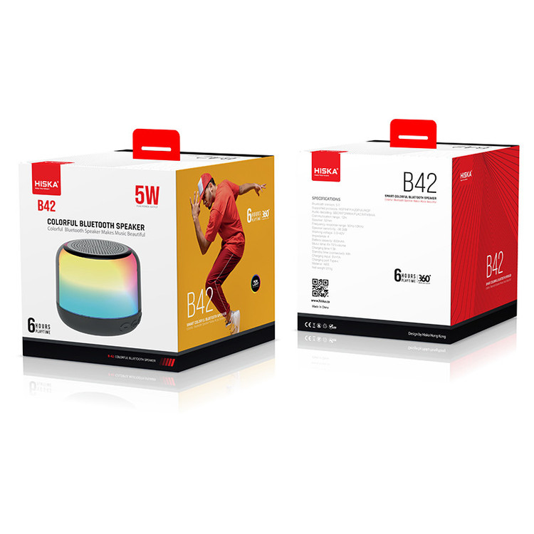 کوچکترین اسپیکری که تا حالا دیدید چه اندازه ای بوده؟ بنظرم B42 هیسکا کوچکترین و البته باکیفیت ترین اسپیکریه که تا حالا دیدید. این اسپیکر با جثه کوچیکش حجم صدای زیادی تولید میکنه و همینطور دارای نورپردازی RGB 360 درجه است که زیبایی آن را چند برابر میکنه. این اسپیکر از توان خروجی 5 وات بهره میبره که با توجه به سایز کوچیکش کیفیت صدا و بیس خوبی داره. همچنین زیر اسپیکر پایه های پلاستیکی تعبیه شده که از لرزش و تکان خوردن هنگام پخش موزیک جلوگیری کنه. این اسپیکر دارای کلید های کنترل صدا و کلید تغییر رنگ RGB و دکمه روشن و خاموش است. باتری B42 ظرفیت 600 میلی آمپر ساعتی دارد، که در 1.5 ساعت کامل شارژ میشه و تا 6 ساعت به شما امکان گوش دادن به موسیقی مورد علاقتون رو میده. همچنین این محصول دارای یک کابل شارژ تایپ سی و یک بند حمل می باشد که باعث راحتی در جابجایی آن میشود. به طور کلی B42 یک اسپیکر جمع و جور و البته زیباست که میتونید همه جا کنار خودتون داشته باشید.