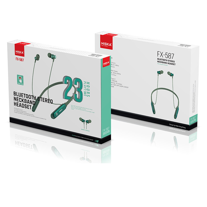 هندزفی گردنی یکی از انواع هندزفری است که طرفداران زیادی بین نسل جوان و ورزشکارها دارد و فاکتورهایی مانند بی سیم بودن، استفاده راحت، طراحی جذاب و از همه مهمتر قیمت مناسب نسبت به هندزفری بی سیم باعث شده تا افراد زیادی جذب این محصول شوند. یکی از نمونههای این محصول توسط شرکت هیسکا طراحی شده و عنوان هندزفری بی سیم گردنی هیسکا مدل FX-587 به آن اختصاص یافته است. طراحی بسیار سادهای دارد و در عین سادگی بسیار جذاب و شیک است؛ ساختارش را پلاستیک بسیار مقاوم ABS تشکیل داده و بسیار انعطافپذیر و مقاوم در برابر خمش است. دو کلاهک سیلیکونی هم برای گوشیها در نظر گرفته شده تا در صورت استفاده طولانی دچار درد و اذیت نشوید. و به علت سبک بودن و طراحی اسپرت، برای تمرینات ورزشی مناسب است و چون راحت از گردن نمیافتند به راحتی میتوانید ورزشتان را با موسیقی همراه کنید. گوشیها از قابلیت مغناطیسی برخوردار بوده و هنگامی که نمیخواهید آهنگ گوش کنید با قرار گرفتن دور گردن و جذب گوشیها به هم مانع افتادن یا برخورد به هم هنگام فعالیت و راه رفتن میشود. روی کابل یک پنل کنترل وجود دارد که با استفاده از کلیدهای آن میتوانید دستورات مورد نیازتان را اجرا کنید. مثلا هندزفری را خاموش یا روشن کنید؛ آهنگ را تغییر دهید؛ تماس را پاسخ دهید یا قطع کنید. باتری هدفون بلوتوث FX-587 دارای ظرفیتی برابر با 250 میلیآمپر ساعت است. و در مدت 1.5 ساعت با استفاده از درگاه Type-c طراحی شده روی بدنه به صورت کامل شارژ میشود. شارژ باتری درحالت پخش موسیقی تا 23 ساعت و در حالت مکالمه تا 25 ساعت برقراری تماس را پاسخگوست. نسخه بلوتوث این هدفون وایرلس دورگردنی 5.0 است و اتصالی بسیار سریع و پایدار را به همراه دارد. در ضمن این ورژن بلوتوث به کاهش حجم مصرف باتری منجر میشود و عمر باتری بالاتری را به ارمغان میآورد. برد مسافتی آن 12 متر بوده و شما میتوانید تا فاصله 12 متری به هندزفری گردنی متصل باشید. همچنین در سمت چپ این هندزفری گردنی یک پنل لمسی برای کنترل تماس ها و موسیقی قرار دارد که کاربری آن را بسیار راحت می کند. فناوری HiFi برنامهریزی شده در این محصول هم صدایی با دقت بالا و همه جانبه را ارسال میکند. و از پروتکلهای HSP/HFP/A2DP/AVRCP پشتیبانی میکند.