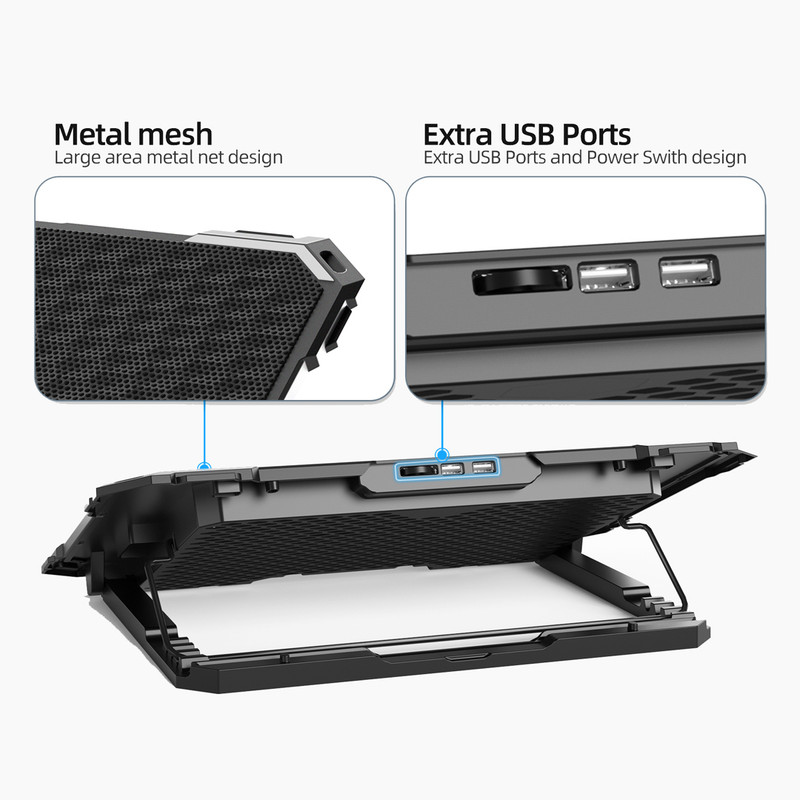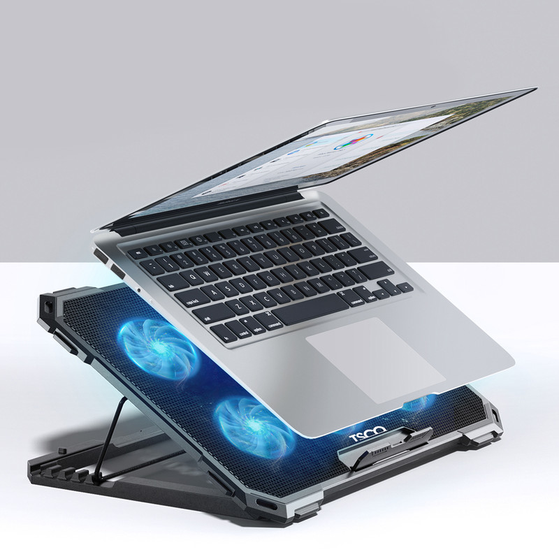 کول پد تسکو مدل TCLP 3119 از ترکیب پلاستیک و مش آهنی ساخته شده است. به همین خاطر یک مدل سبک، شیک و البته قوی است. روی مش این لپتاپ به تنفس بهتر لپتاپ کمک شایانی میکند. TCLP 3119 در ابعاد 420x290x31 میلیمتر طراحی شده و رنگ مشکی این کول پد ظاهری شیک و رسمی به آن میدهد. وزن سبکی دارد و حدوداً 800 گرم است. همچنین این کول پد مجهز به 12 LED است که نورپردازی rgb زیبایی به هنگام استفاده نمایش میدهد. مشخصات فنی کول پد تسکو مدل TCLP 3119 کول پد تسکو مدل TCLP 3119 برای لپتاپهای 15.6 اینچی مناسب است. در طراحی این کول پد از 6 فن با ابعاد 70x15 میلیمتر استفاده شده است. این 6 فن قدرتمند با سرعتی حدود 2500+/-10% RPM دور بر دقیقه میچرخند. این چرخش جریان هوای بسیار مطلوبی ایجاد میکند و بهسرعت دمای لپتاپ را پایین میآورد. شما بهراحتی میتوانید این کول پد را با دکمه ON/OFF دستگاه، خاموش و روشن کنید. در پشت این کول پد دو پورت USB قرار داده شده است. یکی از این پورتها برای جبران پورتی که کول پد از لپتاپ اشغال میکند و دیگری یک پورت اضافه است تا بتوانید هر دستگاهی را که مد نظرتان است به لپتاپ متصل کنید. اگر به پشت این فن دقت کنید، علاوه بر پورتهای USB یاد شده، یک جفتپایه نیز میبینید. پایههای تنظیم ارتفاع این کول پد برای تنظیم زاویه استفاده راحتتر از لپتاپ تعبیه شدهاند. به همراه این کول پد یک کابل PC نیز به شما ارائه میشود.